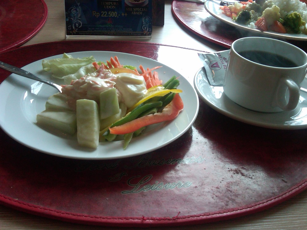 Pagi ini agak tidak berselera makan, jadi mungkin salad dan kopi kental bisa mengusir rasa lapar dan nyeri kepala ini.