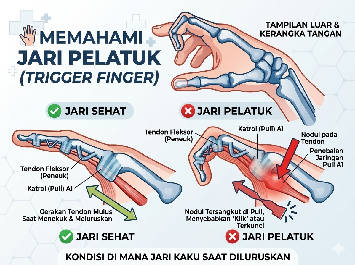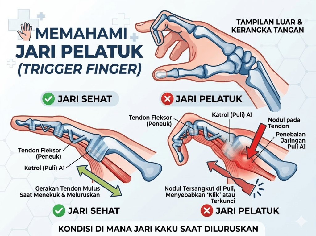 Untuk memahaminya, bayangkan tendon sebagai tali yang menggerakkan jari. Tali ini harus melewati serangkaian cincin penahan di sepanjang tulang jari. Ketika salah satu cincin tersebut menyempit — atau ketika tali (tendon) membengkak — pergerakan menjadi terhambat. Saat tendon yang membengkak dipaksa melewati cincin yang menyempit, muncullah sensasi “klik” atau “plup” yang khas, disertai nyeri. Pada kasus yang berat, tendon bahkan bisa terjepit sepenuhnya sehingga jari tidak dapat diluruskan sama sekali.