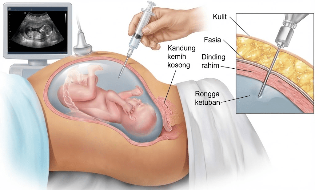 - Panduan USG (Ultrasonografi): Dokter menggunakan USG untuk melihat posisi janin dan mencari kantong cairan ketuban yang aman, jauh dari tubuh bayi dan plasenta.