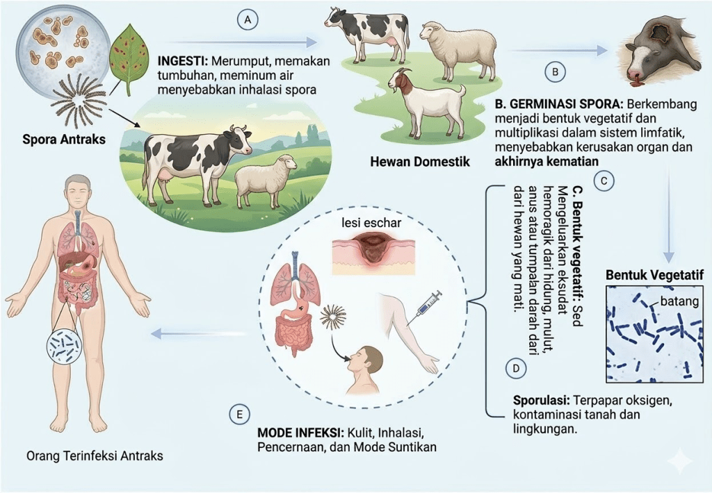 Berdasarkan tinjauan klinis terbaru yang dipublikasikan di jurnal Diagnostics, antraks termasuk penyakit zoonosis penting yang utamanya menginfeksi herbivora dan secara oportunistik menginfeksi manusia. Infeksi pada manusia terjadi melalui kontak dengan hewan sakit atau mati, produk hewan yang terkontaminasi, paparan langsung terhadap spora di lingkungan, atau spora yang disebarkan secara sengaja dalam konteks bioterorisme.