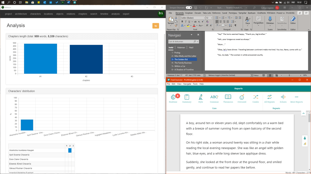 Dengan software tersebut, penulis bisa melakukan analisis terhadap perkembangan alur cerita, pelibatan tokoh, konflik, latar belakang, alur waktu, target penyelesaian sebuah bab, dan sebagainya.