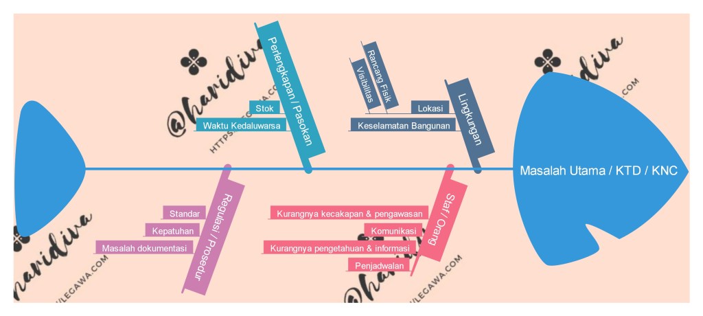 Penyebab-penyebab utama dapat dikategorikan di bawah judul-judul yang dapat dimodifikasi berikut: methods or systems (metode atau sistem), machine or equipment (alat atau peralatan), manpower or people (SDM atau orang), materials (bahan/material), environment (lingkungan), dan measurement (pengukuran).