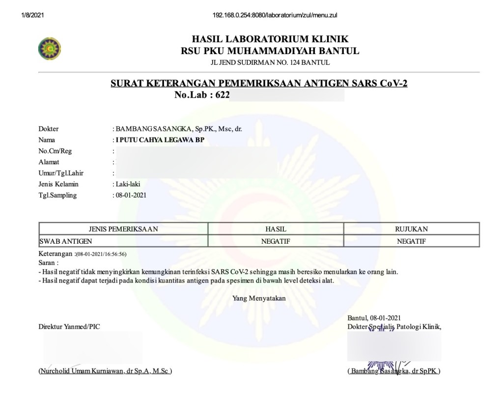 Saya melaluikan pemeriksaan swab antigen di RSU PKU Muhammadiyah Bantul, setelah janjian, saya datang pada waktu yang ditentukan. Saat itu pemeriksaan dikenakan biaya IDR 250K, dan saya membayar sebagai pasien umum.