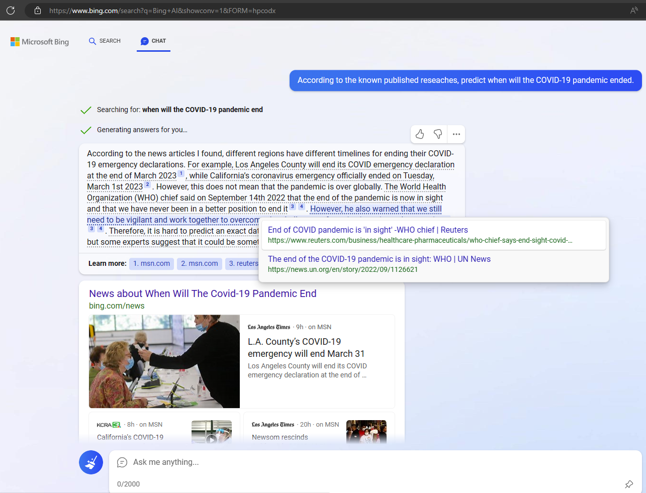 Bagaimana AI bisa membantu pengguna dalam melakukan penelusuran. Jika penelusuran biasa ibaratnya kita masuk ke perpustakaan kemudian mencari sendiri buku-buku mana yang kita perlukan dan membukanya satu per satu untuk mencari jawaban. Maka AI dalam hal ini Bing Chat akan membantu pengguna menjawab pertanyaan yang diajukan dalam bentuk ringkasan, kemudian memberi petunjukan di mana bagian ringkasan itu dapat dibaca lebih lengkap lagi.