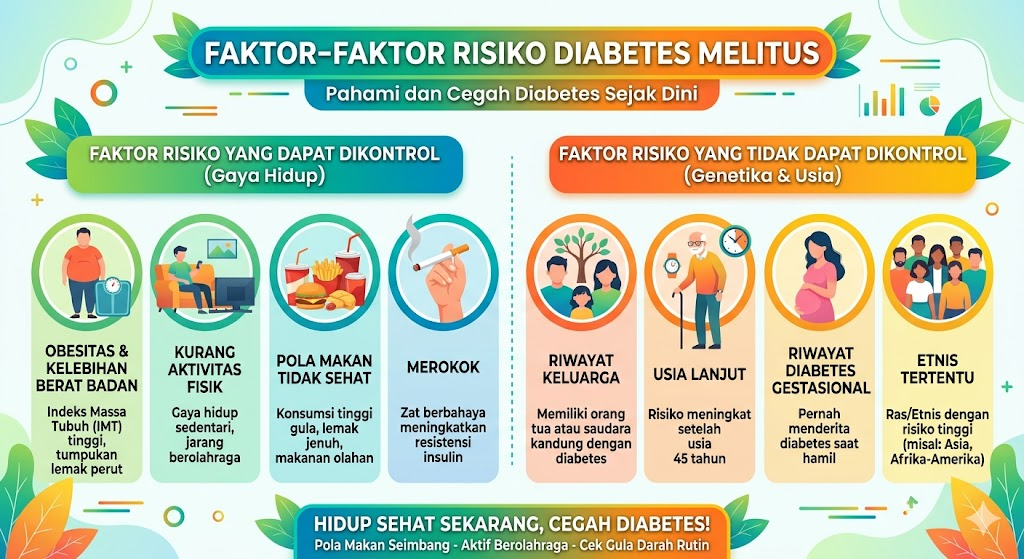 Dalam dunia medis, faktor risiko diabetes melitus umumnya dibagi ke dalam dua kelompok besar: faktor yang tidak dapat dimodifikasi—yaitu kondisi bawaan atau biologis yang tidak bisa diubah hanya dengan perubahan perilaku—dan faktor yang dapat dimodifikasi—yaitu hal-hal yang berkaitan dengan pilihan gaya hidup dan kondisi yang masih bisa dipengaruhi melalui intervensi.