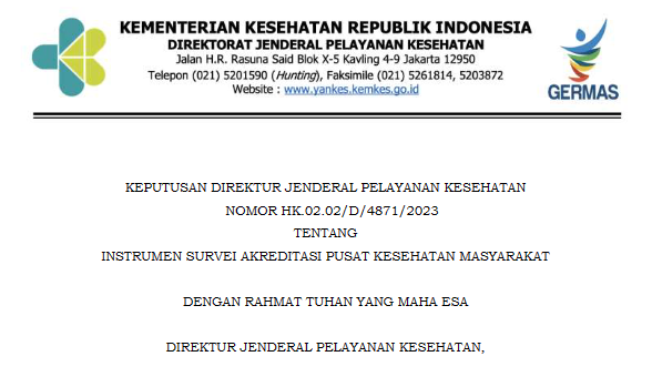 Berikut adalah salinan KEPUTUSAN DIREKTUR JENDERAL PELAYANAN KESEHATAN NOMOR HK.02.02/D/4871/2023 TENTANG INSTRUMEN SURVEI AKREDITASI PUSAT KESEHATAN MASYARAKAT.