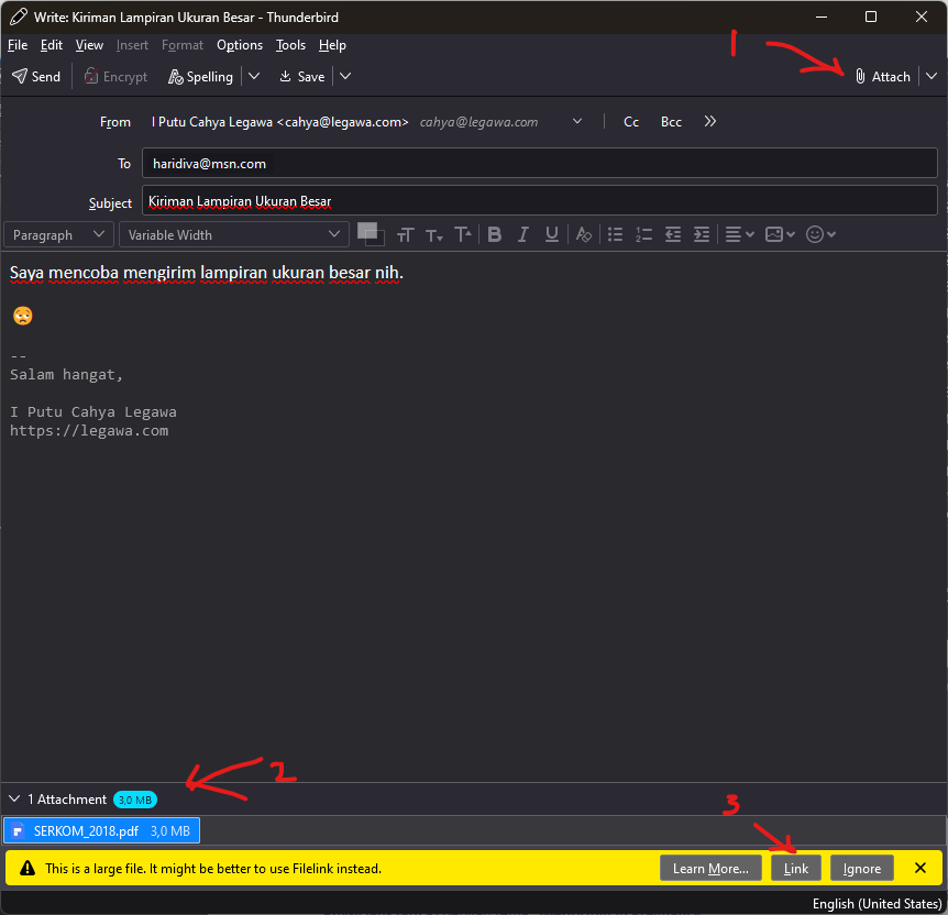 Anda akan melihat berkas attachment di bagian bawah jendela penulisan email. Lalu ada satu lagi pita kuning di bawahnya yang menyatakan dengan tanda peringatan bahwa berkas tersebut adalah berkas berukuran besar, dan menyarankan lebih baik menggunakan filelink. Catatan: berkas ukuran besar disesuaikan dengan pilihan di setelan/setting.
