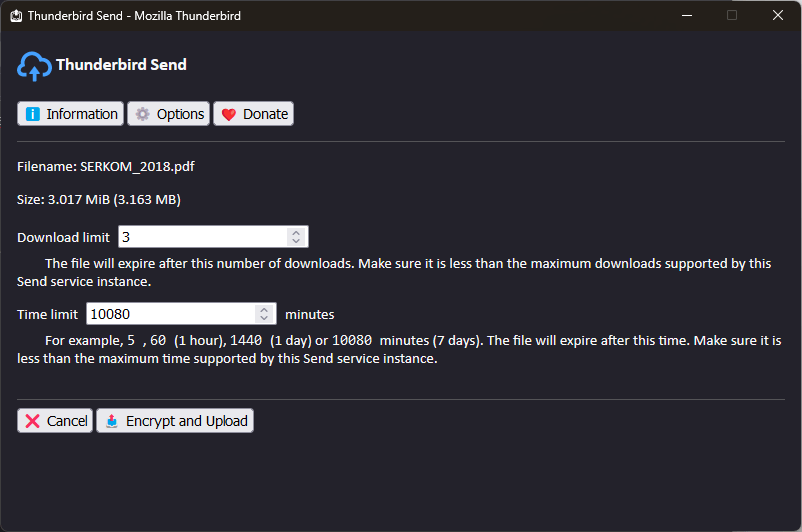 Atau dengan memilih Thunderbird Send, Anda bisa melihat pilihan yang bisa disesuaikan berdasarkan daftar instansi layanan pengiriman publik. Misalnya, instansi mana yang ingin dipakai, seberapa kali berkas bisa diunduh, seberapa lama berkas akan dititipkan, dan berapa ukuran berkas maksimal yang bisa dititipkan.