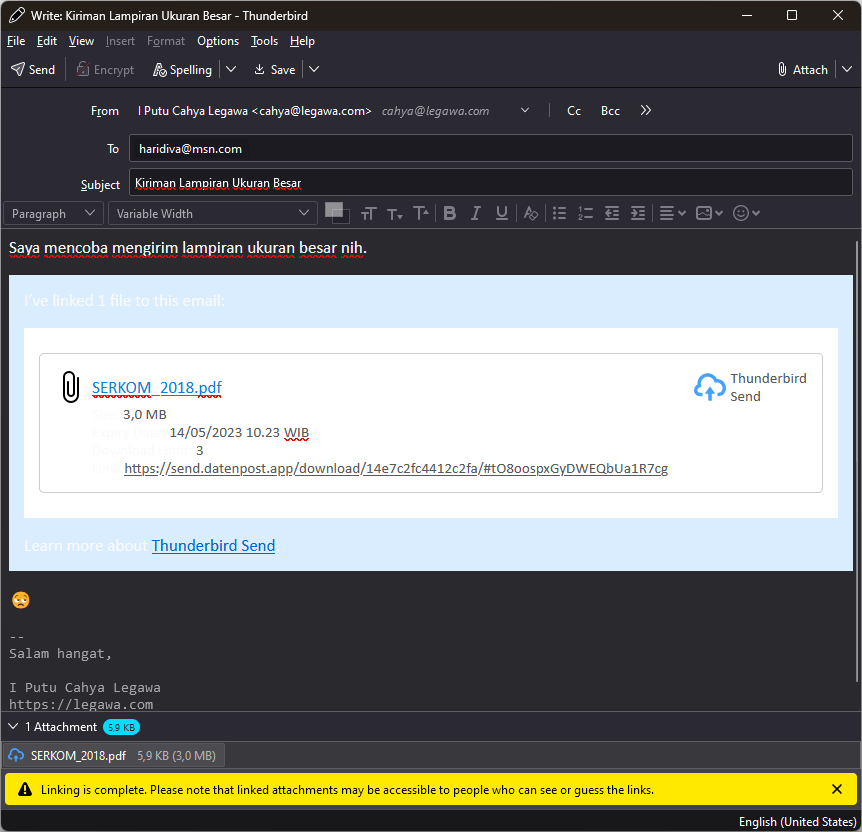 Solusi-nya adalah menitipkan berkas lampiran ke pihak ketiga, diunggah ke layanan lain dan kemudian tautan unduhannya dikirimkan ke penerima. Ada beberapa pilihan populer yang pernah saya tulis sebelumnya. Tapi kini kita bahas yang khusus melalui pengguna Thunderbird, baik di Windows, Mac, maupun Linux.