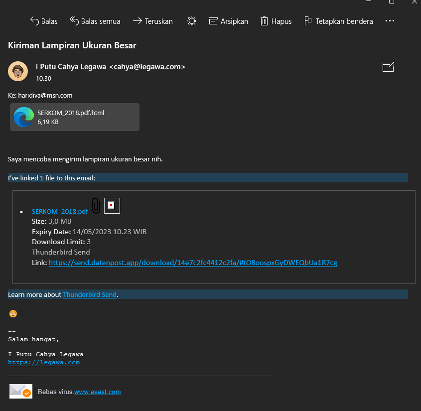 Sebagai tips, jika berkas yang Anda kirimkan bersifat rahasia. Kirimkan berkas yang dititipkan dalam bentuk arsip ZIP atau 7Z, lalu amankan dengan sandi. Dan sandinya dikirim baik bersama email tersebut ataupun melalui email/pesan terpisah.