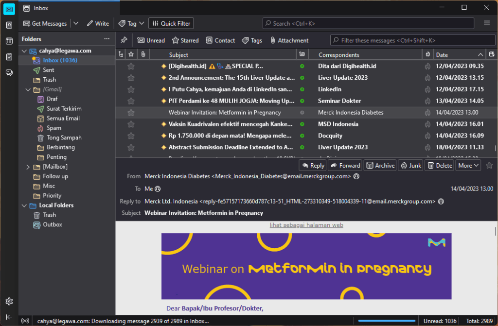 Siapa di PC atau laptop mereka masih menggunakan email client Thunderbird? Kebanyakan sih tidak, karena sekarang dengan internet yang lumayan kencang, surat elektronik lebih banyak diakses di ponsel ataupun di peramban. Kadang juga hanya untuk menerima kabar tidak penting, seperti kabar promosi di e-niaga atau pembaruan di jejaring sosial yang memenuhi kotak masuk.