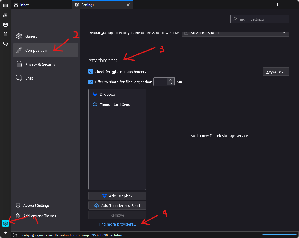 Pertama-tama kita perlu menyetel sistem attachment yang bisa diakses melalui: setting >> composition >> attachments.