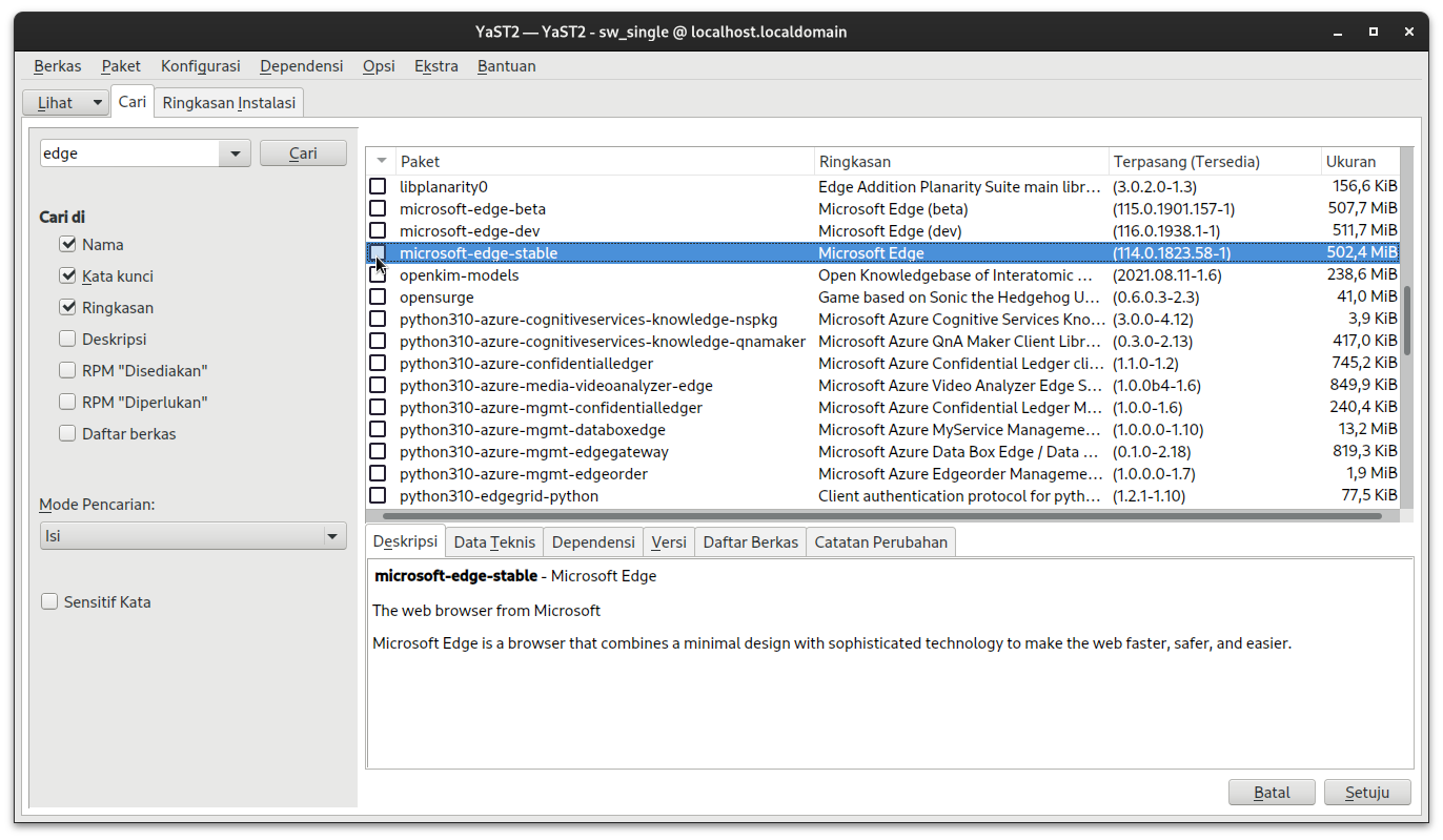 Baru terakhir kita memang Microsoft Edge, jika Anda membuka software management di YaST2, maka di sana ada beberapa pilihan versi Edge yang bisa dipasang.