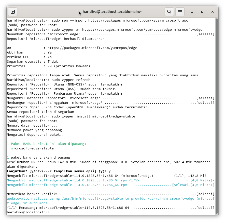 Pengguna openSUSE bisa langsung menuju aplikasi software, mengetik kata kunci edge, dan memilih Microsoft Edge, lalu pilih pasang. Ini paling mudah.