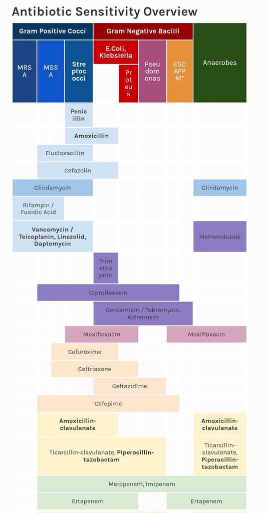 Beberapa contoh antibiotik yang dapat digunakan untuk mengobati infeksi yang disebabkan oleh kokus gram positif adalah penisilin, sefalosporin, makrolida, dan vankomisin. Beberapa contoh antibiotik yang dapat digunakan untuk mengobati infeksi yang disebabkan oleh kokus gram negatif adalah aminoglikosida, fluorokuinolon, karbapenem, dan sulfonamida. Beberapa contoh antibiotik yang dapat digunakan untuk mengobati infeksi yang disebabkan oleh bakteri anaerob adalah metronidazol, klindamisin, dan tinidazol.