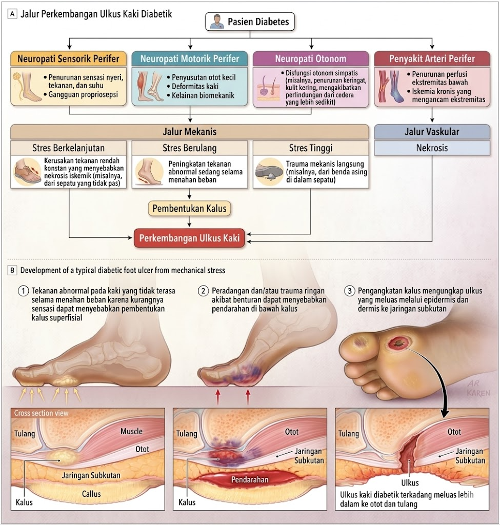 Ulkus kaki diabetes bukan sekadar “luka yang terjadi karena gula darah tinggi.” Ia adalah hasil dari interaksi kompleks antara kerusakan metabolik (hiperglikemia, stres oksidatif, AGEs), kerusakan saraf dalam tiga dimensi (sensorik, motorik, otonom), kerusakan pembuluh darah di dua tingkatan (makro dan mikro), tekanan biomekanik berulang, dan gangguan fundamental pada kemampuan tubuh untuk menyembuhkan diri sendiri.