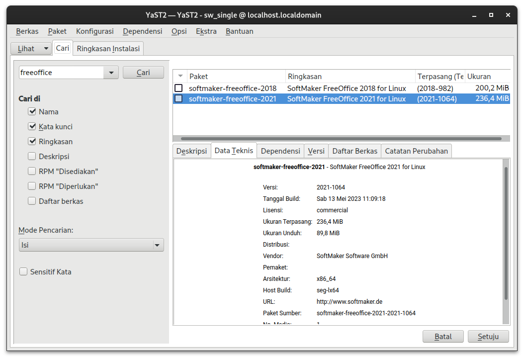Lalu buka YaST dan menuju pengelola perangkat lunak. Dan ketik kata kunci “freeoffice.”