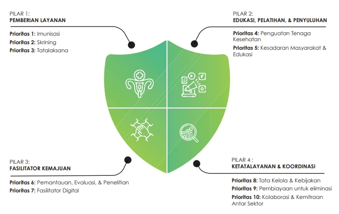 - Pemberian layanan, yang meliputi penyediaan vaksin HPV, alat skrining HPV DNA, dan fasilitas tatalaksana yang berkualitas dan terjangkau bagi seluruh perempuan di Indonesia.