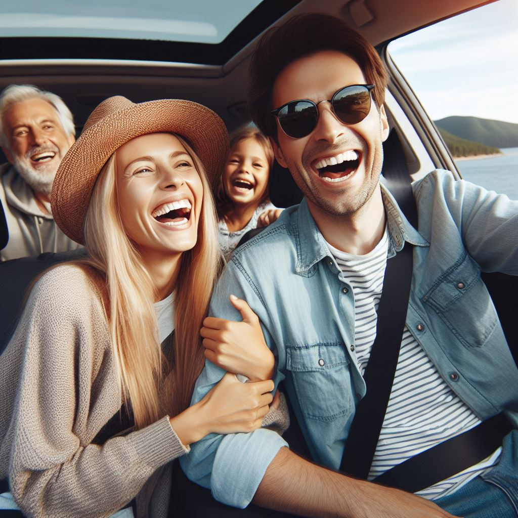 - Image: A family laughing and enjoying a road trip.