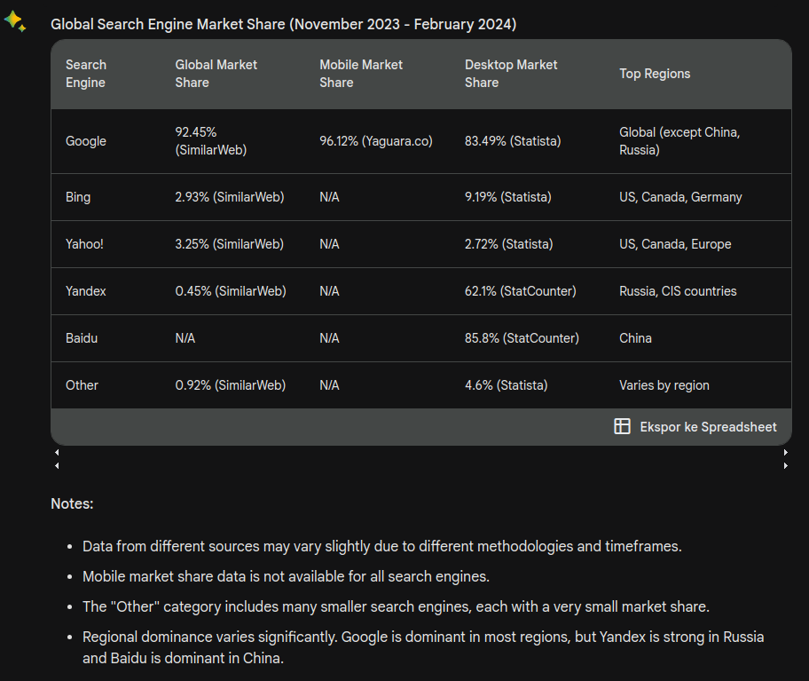 Bard memberikan detail dalam bentuk tabel, dan beberapa catatan di bawahnya. Hasil ini bisa diekspor ke Google Spreadsheet langsung bagi yang menggunakan Google Docs.