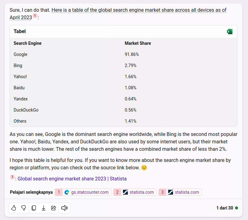 Bing Chat tampak menggunakan data yang lebih lama, tapi lebih mudah terbaca dan dipahami. Serta ada pilihan menyunting dapat langsung dengan Excel bagi yang menggunakan Microsoft 365.