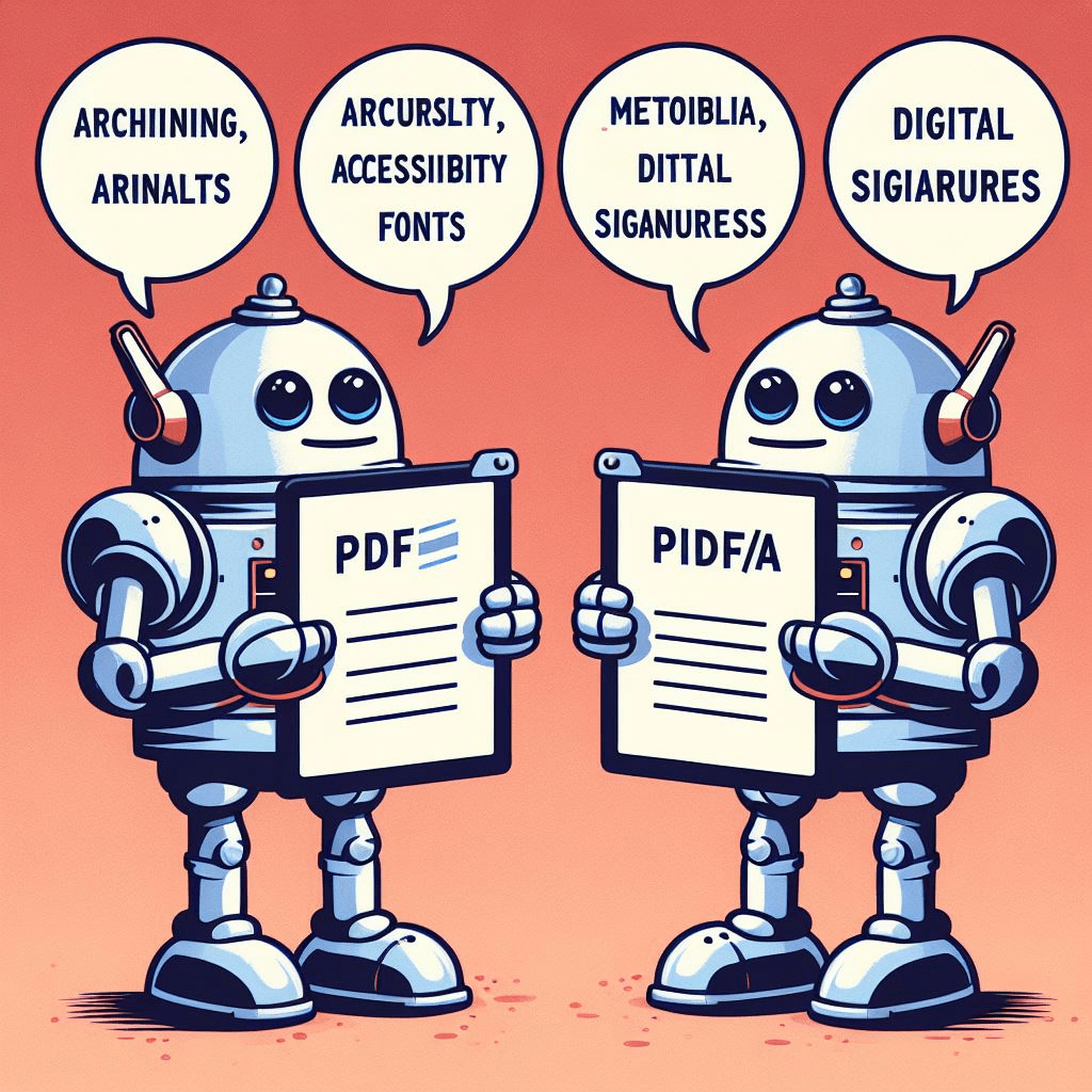 PDF/A (PDF for Archiving) adalah standar ISO yang diturunkan dari PDF, yang dirancang khusus untuk mengatasi masalah-masalah tersebut. PDF/A memiliki beberapa persyaratan dan batasan yang bertujuan untuk memastikan bahwa dokumen PDF dapat disimpan, diarsipkan, dan dibuka kembali dengan mudah dan akurat dalam jangka waktu yang lama. Beberapa perbedaan antara PDF dan PDF/A adalah: