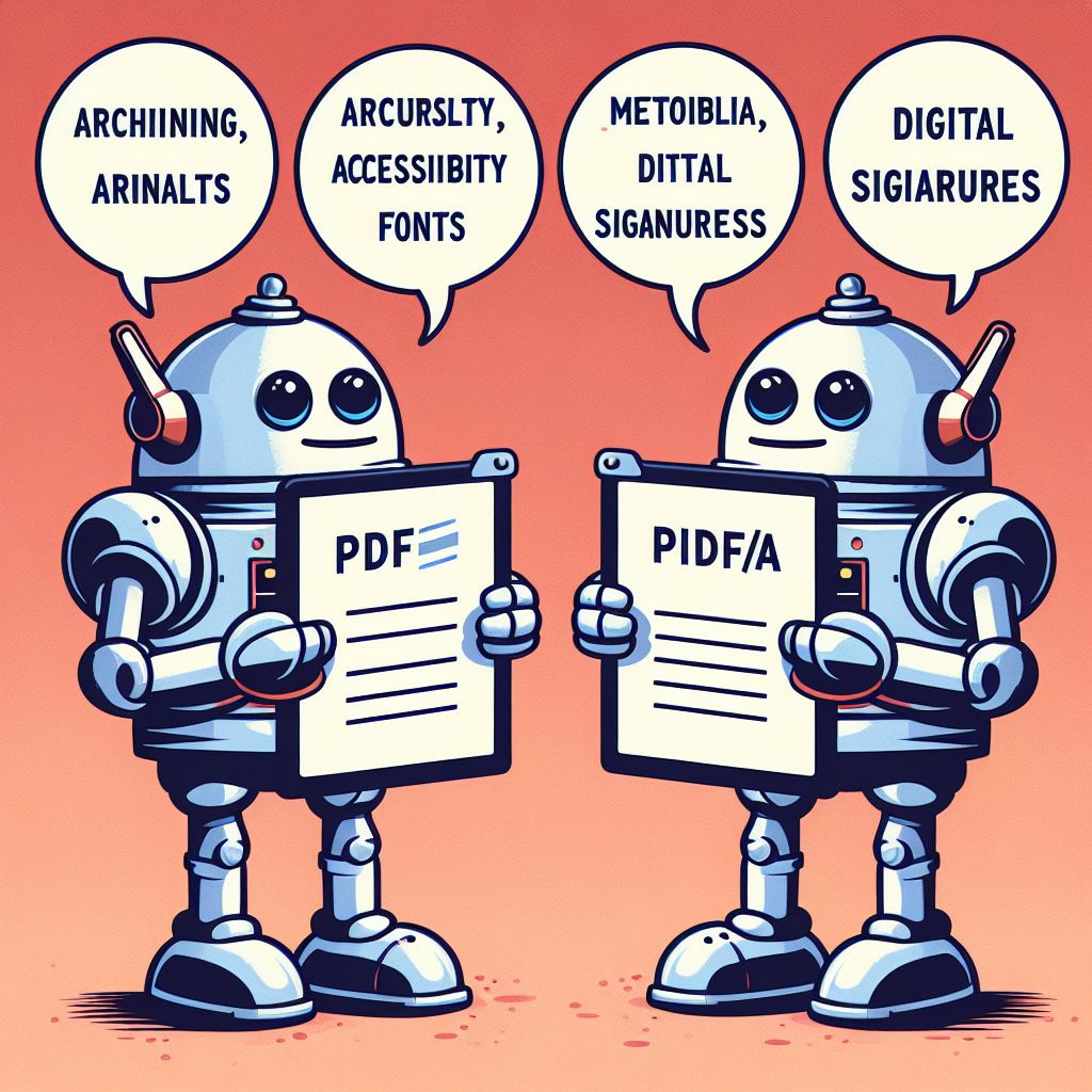 PDF/A (PDF for Archiving) adalah standar ISO yang diturunkan dari PDF, yang dirancang khusus untuk mengatasi masalah-masalah tersebut. PDF/A memiliki beberapa persyaratan dan batasan yang bertujuan untuk memastikan bahwa dokumen PDF dapat disimpan, diarsipkan, dan dibuka kembali dengan mudah dan akurat dalam jangka waktu yang lama. Beberapa perbedaan antara PDF dan PDF/A adalah:
