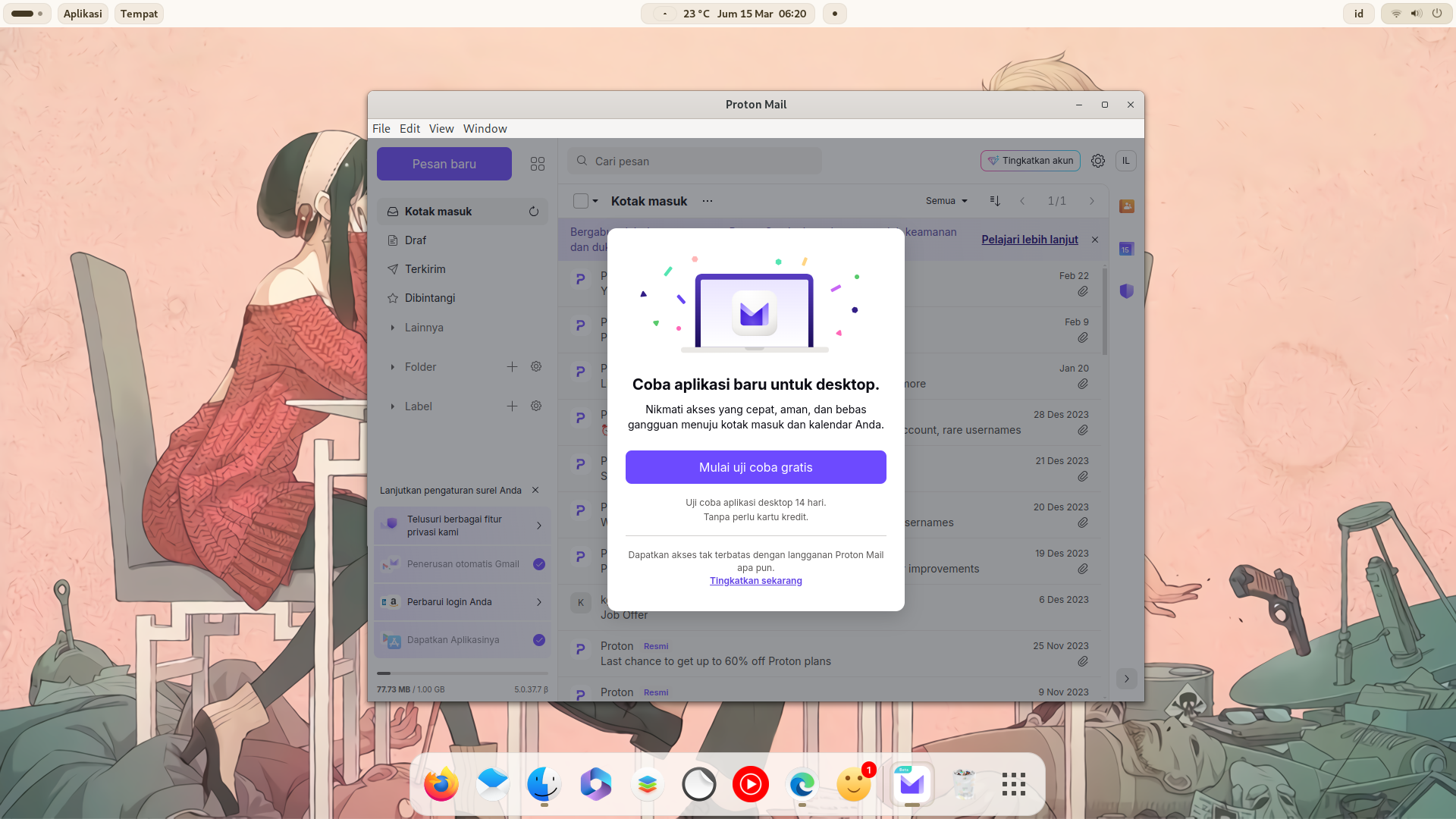 Ada yang memiliki ProtonMail untuk aktivitas berkirim email? Dulu cuma ada aplikasi asli di iOS dan Android, sekarang aplikasinya sudah merambah ke dekstop Windows, Mac, dan Linux; walau Linux masih dalam tahapan beta. Aplikasi ini bisa diunduh dalam paket DEB atau RPM di situs resminya.