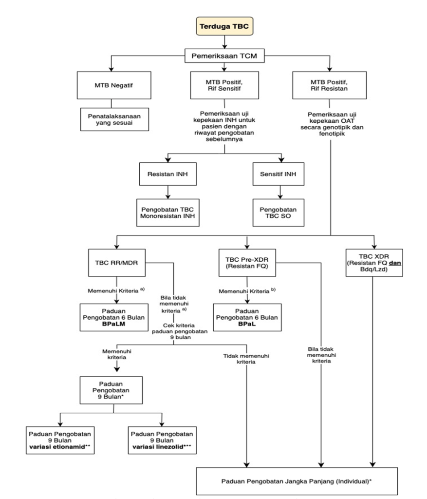 - TB Resisten Rifampisin (RR) atau TBC Multiresisten (MDR): Pasien terinfeksi MTB yang resisten terhadap Rif dan INH, dua obat utama dalam pengobatan TBC. Pasien ini harus diberikan paduan pengobatan 9 bulan yang terdiri dari bedaquiline (Bdq), linezolid (Lza), levofloxacin (Lfx), clofazimine (Cfz), dan sikloserin (Cs). Pengobatan ini bertujuan untuk mengatasi resistensi bakteri dan mengurangi risiko terjadinya TB Ekstensif Resisten (XDR).