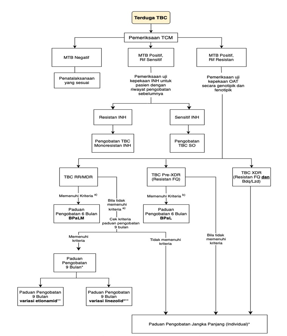 - TB Resisten Rifampisin (RR) atau TBC Multiresisten (MDR): Pasien terinfeksi MTB yang resisten terhadap Rif dan INH, dua obat utama dalam pengobatan TBC. Pasien ini harus diberikan paduan pengobatan 9 bulan yang terdiri dari bedaquiline (Bdq), linezolid (Lza), levofloxacin (Lfx), clofazimine (Cfz), dan sikloserin (Cs). Pengobatan ini bertujuan untuk mengatasi resistensi bakteri dan mengurangi risiko terjadinya TB Ekstensif Resisten (XDR).