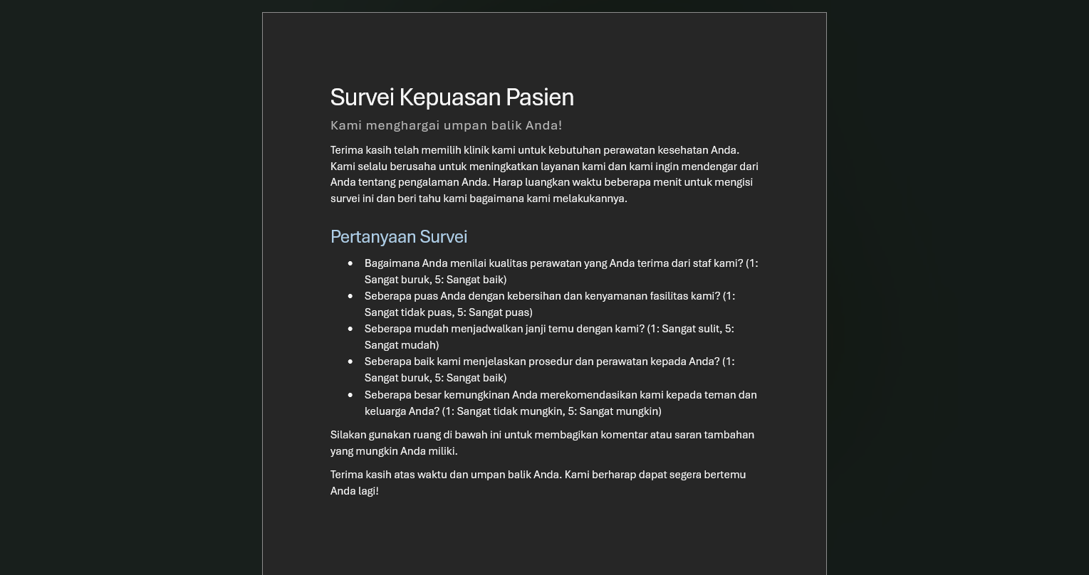 Dengan mengikuti langkah-langkah ini, survei kepuasan pasien dapat menjadi alat yang sangat berharga dalam meningkatkan mutu layanan kesehatan. Survei yang dirancang dengan baik tidak hanya akan memberikan wawasan yang berharga tentang pengalaman pasien, tetapi juga akan menunjukkan komitmen fasilitas kesehatan terhadap peningkatan berkelanjutan.