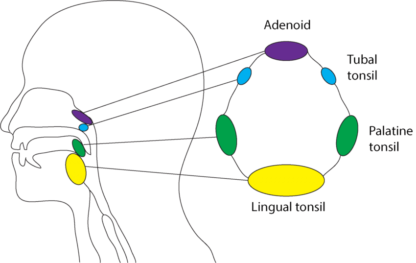 - Amandel Faringeal (Adenoid): Terletak di atas amandel palatina, di belakang hidung.