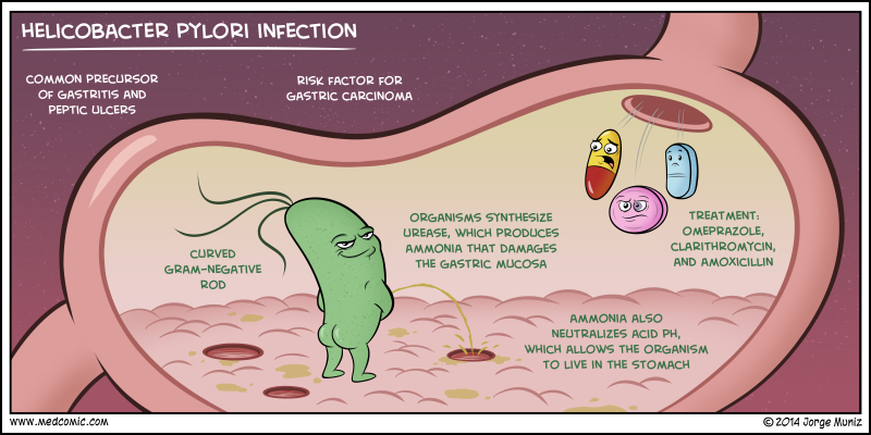 Helicobacter pylori (H. pylori) adalah bakteri spiral yang ditemukan di dalam lapisan mukosa lambung dan duodenum. Ia dikenal karena kemampuannya menghasilkan enzim urease, yang memungkinkannya menetralisir asam lambung dan bertahan hidup di lingkungan yang seharusnya mematikan bagi kebanyakan bakteri.