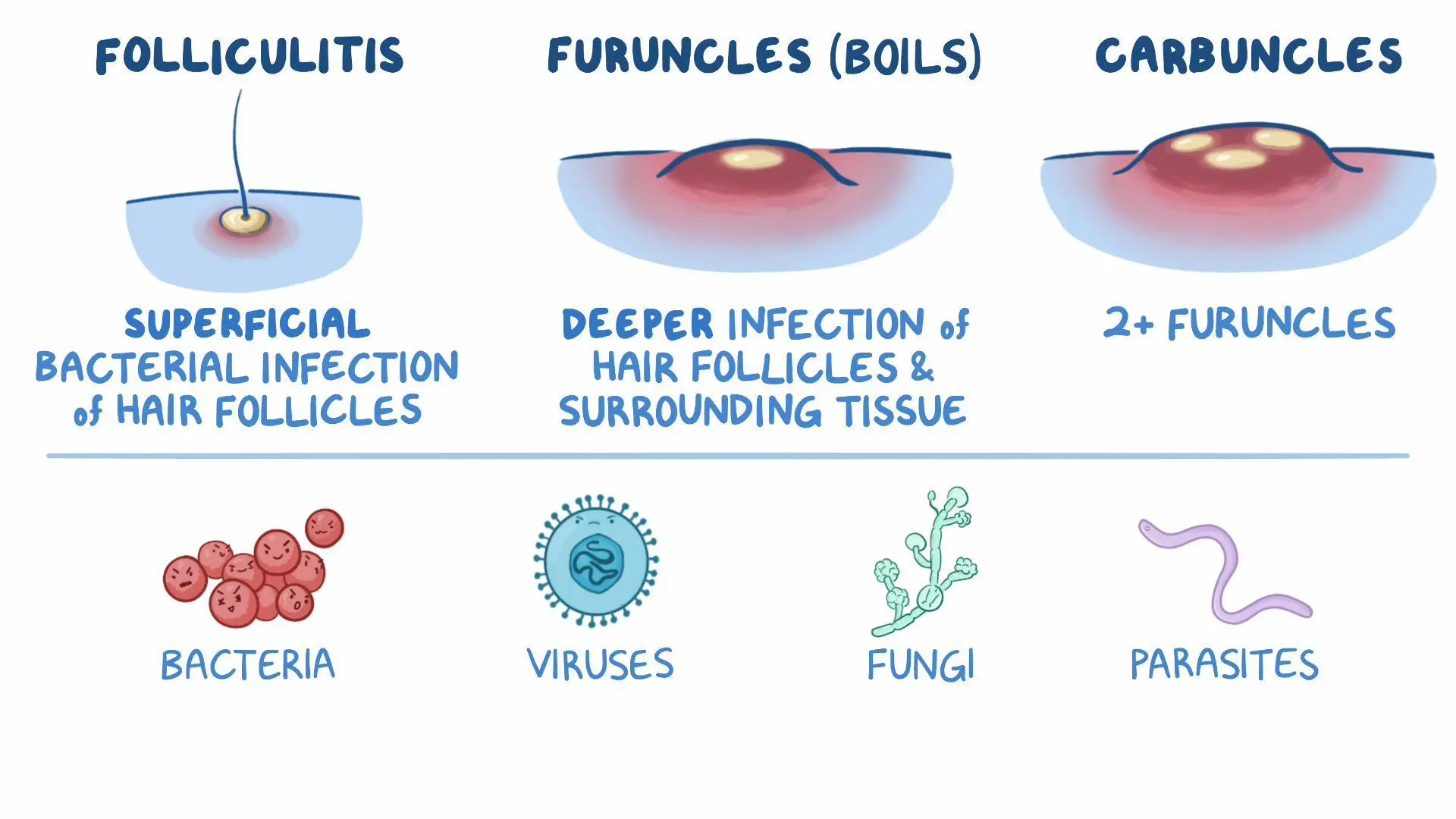 - Infeksi Bakteri: Baik furunkel maupun karbunkel umumnya disebabkan oleh bakteri Staphylococcus aureus yang masuk melalui luka kecil, goresan, atau iritasi pada kulit.