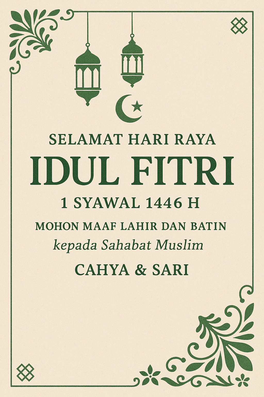 Tak terasa, bulan suci Ramadan yang penuh berkah telah kita lalui. Seiring dengan hilal yang telah tampak, kumandang takbir, tahmid, dan tahlil pun menggema, menandakan datangnya hari kemenangan yangFitri dan penuh kebahagiaan: Hari Raya Idul Fitri 1446 Hijriah!