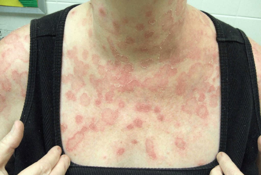 Ditandai dengan bercak merah melingkar yang bersisik, terkadang dengan batas yang jelas. Ruam ini sering disebut “ringworm” karena bentuknya yang mirip cincin. - Pengobatan:
