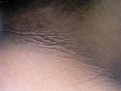 Permukaan kulit yang terpengaruh sering terasa kaku dan kasar, serupa dengan tekstur kulit beludru atau kulit jeruk. - Lokasi Umum: