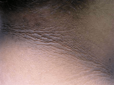 Area yang sering terdampak adalah leher, ketiak, selangkangan, dan belakang lutut. Namun, kondisi ini juga dapat muncul pada lipatan kulit lain atau bahkan pada permukaan tangan dan kaki.