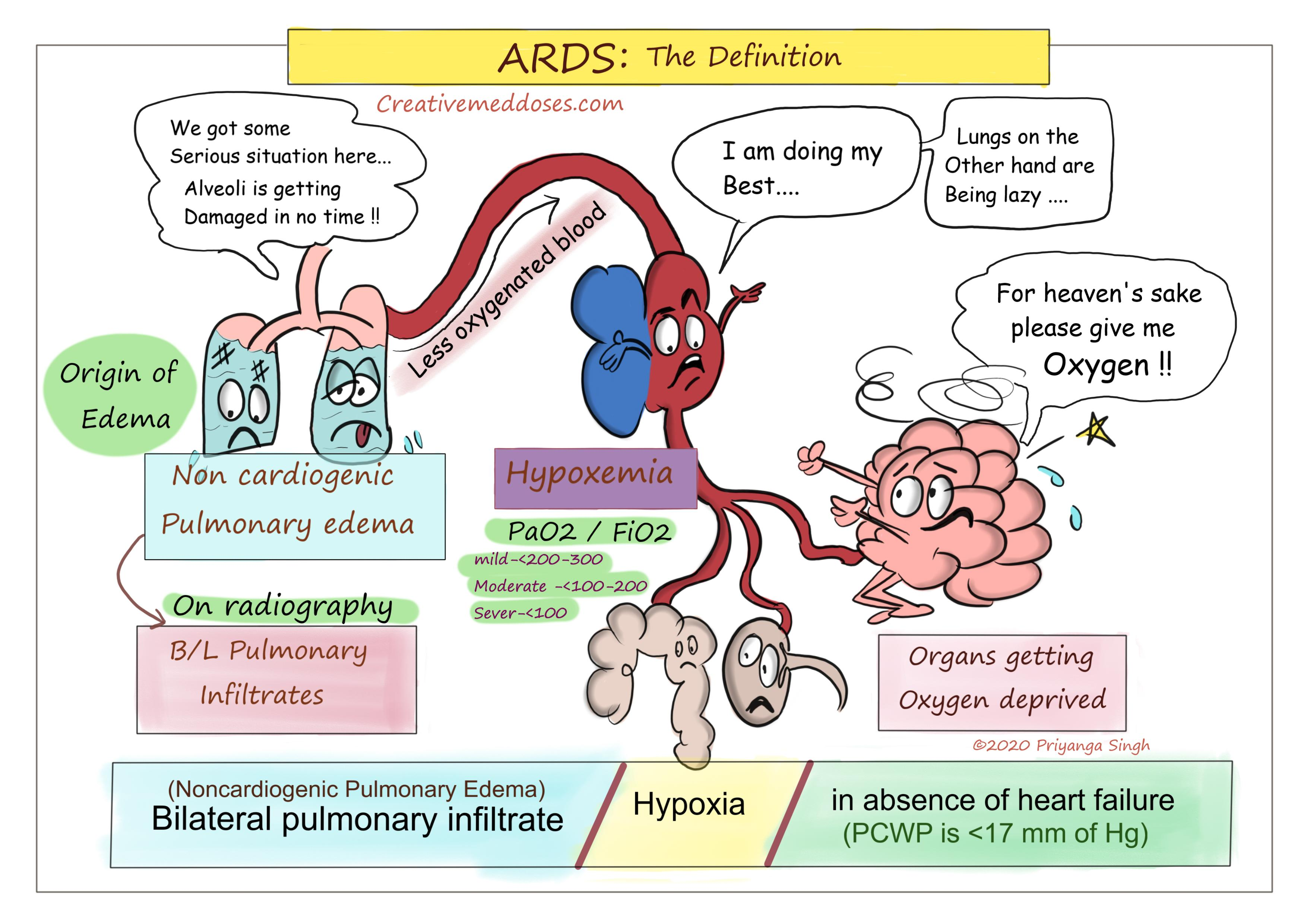 ARDS adalah kondisi paru-paru akut yang ditandai oleh peradangan berat, peningkatan permeabilitas kapiler paru, dan akumulasi cairan di alveolus. Akibatnya, oksigenasi darah terganggu, sehingga organ vital seperti otak dan jantung tidak mendapatkan cukup oksigen untuk berfungsi dengan baik. Kondisi ini sering terjadi pada pasien yang sudah mengalami penyakit serius, trauma, atau infeksi sistemik.