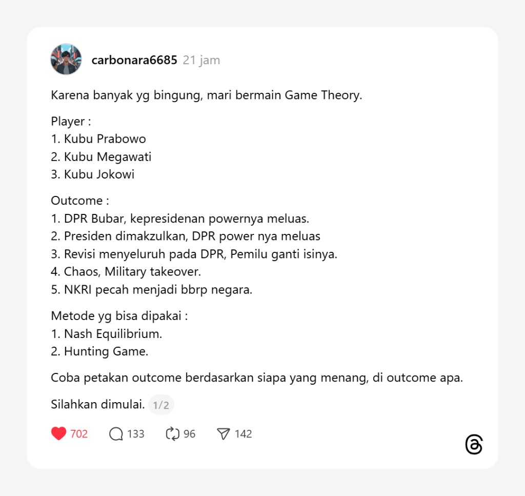 Based on current strategic configurations and institutional dynamics, the most likely outcome is gradual authoritarian consolidation through constitutional manipulation and military expansion, while maintaining formal democratic institutions. This path allows Kubu Prabowo to maximize power while offering selective accommodation to other camps and avoiding triggering unified opposition.