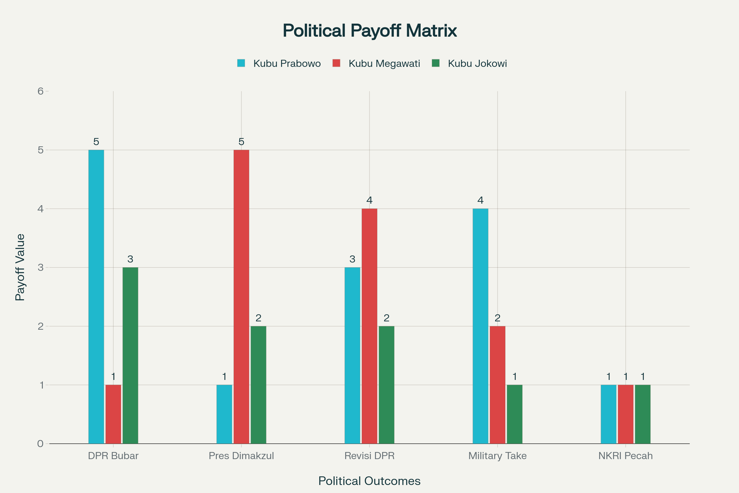 Cooperative equilibrium emerges when Kubu Prabowo offers meaningful accommodation to Kubu Megawati through cabinet positions or policy concessions, while managing Kubu Jokowi’s influence through continued inclusion of key appointees. This scenario maximizes stability but requires Prabowo to share power and limit military expansion. PDI-P’s strategic interest lies in securing concrete benefits while maintaining some independence.