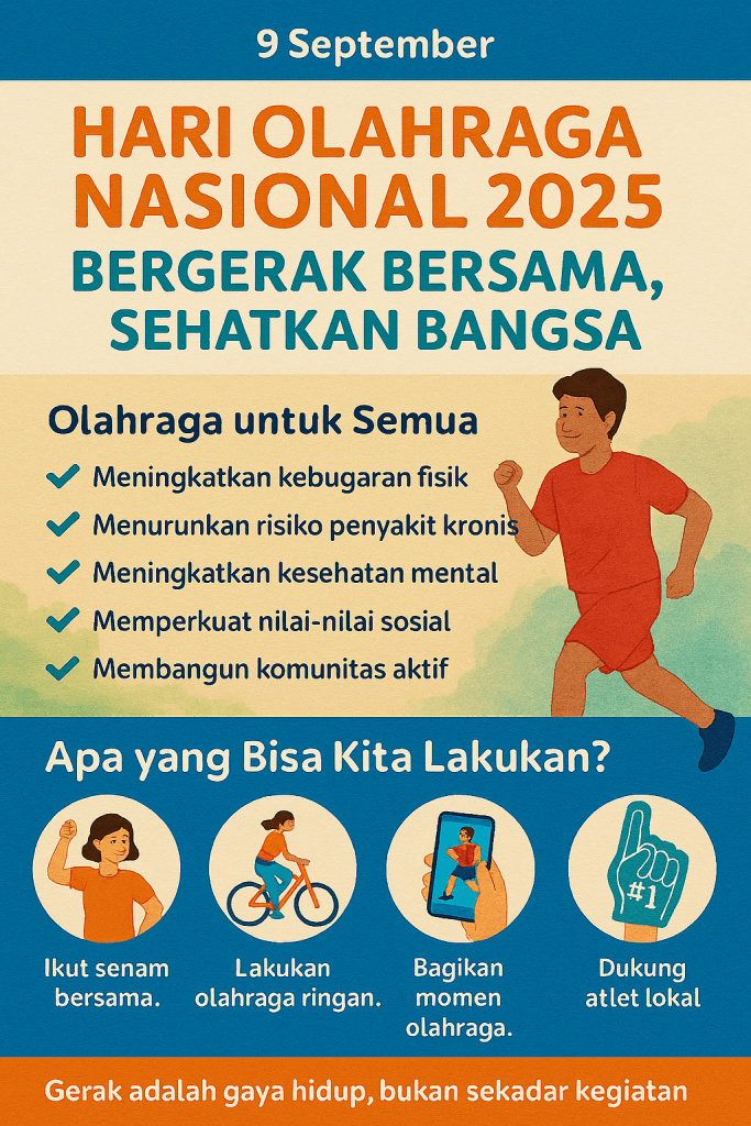 Hari Olahraga Nasional 2025 mengajak kita untuk menjadikan gerak sebagai bagian dari identitas bangsa. Di tengah tantangan kesehatan global dan gaya hidup sedentari, olahraga adalah solusi sederhana yang berdampak besar. Mari kita bergerak bersama—untuk tubuh yang sehat, jiwa yang kuat, dan Indonesia yang tangguh.