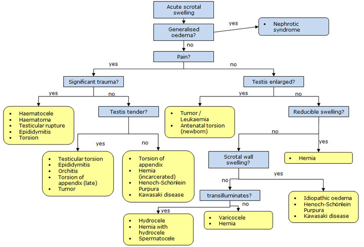 Anamnesis yang cermat, pemeriksaan fisik, dan ultrasonografi biasanya cukup untuk menegakkan diagnosis. Intervensi bedah urgent jarang diperlukan pada kelompok kondisi ini, kecuali terdapat komplikasi yang mengancam viabilitas testis.