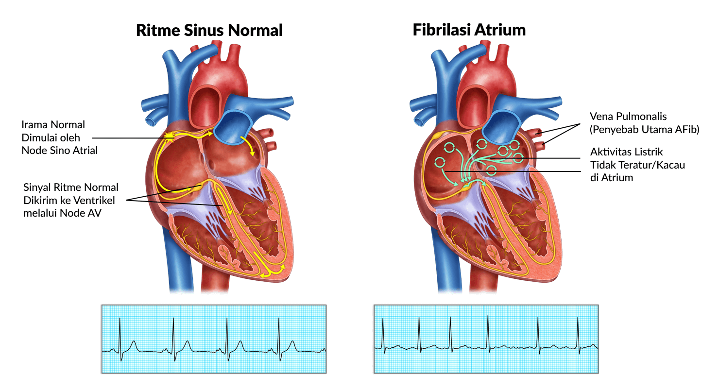 Pada kondisi normal (disebut irama sinus), sinyal listrik dimulai dari satu titik di atrium kanan yang disebut Nodus Sinoatrial (SA Node). Sinyal ini menyebar rapi, membuat kedua atrium berkontraksi memeras darah ke ventrikel, lalu ventrikel memompa darah ke seluruh tubuh.