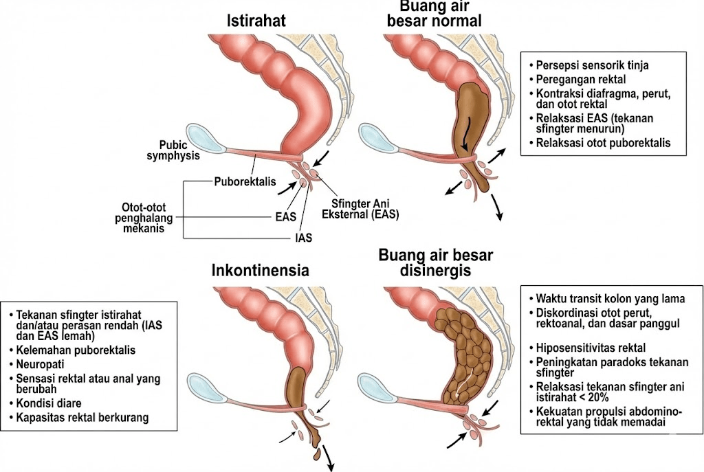 Sfingter ani internal bertanggung jawab atas sekitar 70–85% tekanan istirahat anus dan bekerja secara involunter (tidak sadar). Sfingter ani eksternal dan otot puborektalis memberikan kontraksi volunter (sadar) yang penting saat menahan dorongan untuk buang air besar. Sudut anorektal yang dibentuk oleh otot puborektalis juga berperan sebagai mekanisme katup yang membantu menjaga kontinensia. Ketika salah satu atau beberapa komponen ini mengalami gangguan, risiko inkontinensia alvi meningkat (Bharucha dkk., 2022; Dexter dkk., 2024).