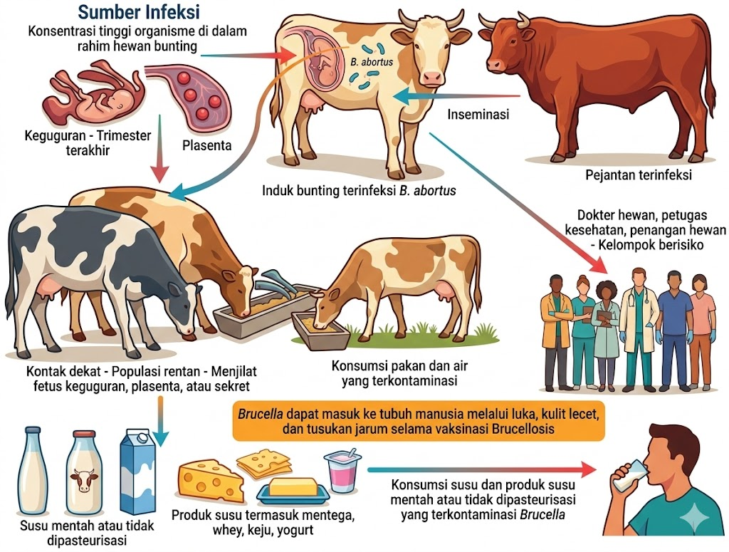Penularan brucellosis ke manusia terjadi melalui beberapa jalur utama yang perlu dipahami, terutama oleh kelompok masyarakat yang berinteraksi langsung dengan hewan ternak atau produk olahannya.