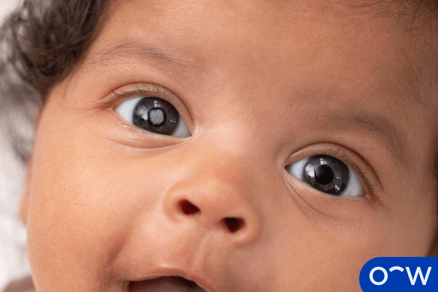 Leukokoria (leukocoria): Ini adalah tanda paling khas — tampilan putih atau keabuan pada pupil mata. Sering kali terlihat pertama kali dalam foto flash ketika refleks merah yang normal justru tampak putih. Leukokoria adalah tanda darurat mata yang harus segera dirujuk, karena ia tidak hanya menandakan katarak, tetapi juga kondisi lain seperti retinoblastoma.
