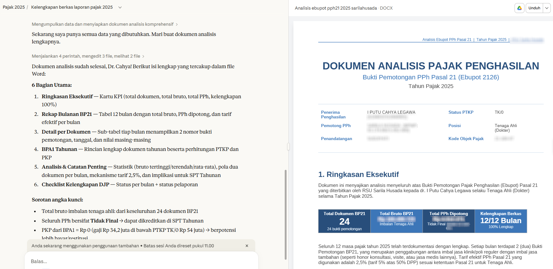 - Dokumen Word berformat profesional dengan enam bagian: ringkasan eksekutif, rekap bulanan, detail per dokumen, analisis BPA1 tahunan, statistik penghasilan, dan checklist kelengkapan DJP.