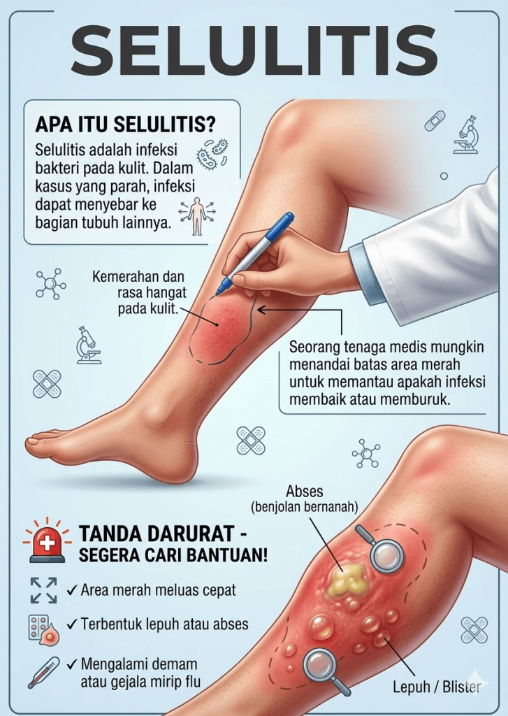 Artikel ini disusun untuk tujuan edukasi dan tidak menggantikan konsultasi medis. Bila Anda atau orang terdekat mengalami gejala yang dicurigai sebagai selulitis, segera hubungi tenaga medis profesional.