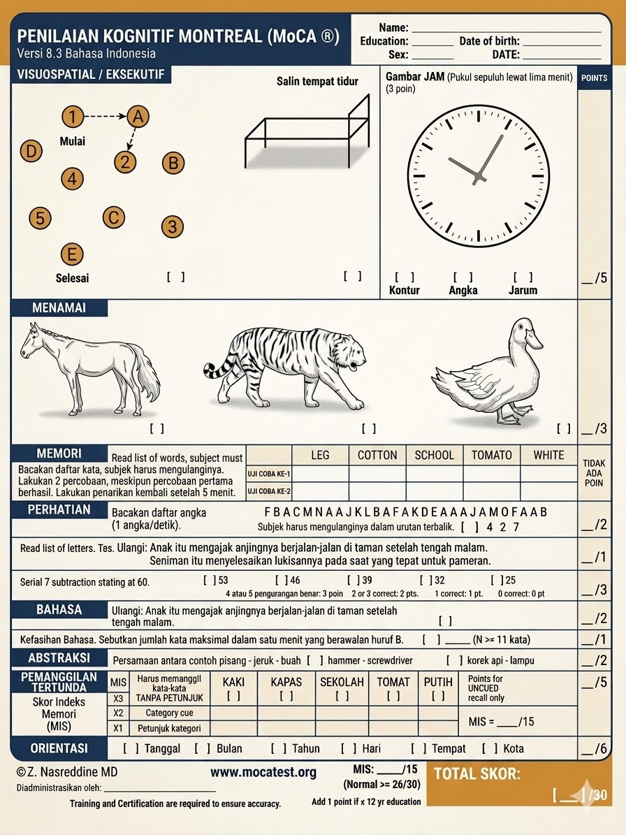 - Skor ≥ 26: Fungsi kognitif dalam batas normal